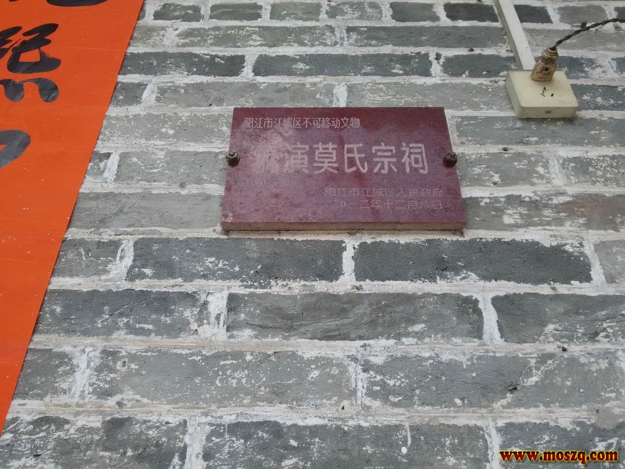 2,瞻仰麻演莫氏宗词,共三进,早三年修复。古迹夺目,其中立祠碑文刻着:始祖自明朝天顺五年(l461年),苖贼作乱,焚毁庐舍,由恩平县那西村迁于阳春合水莲塘,再住蟠龙茅坪村,最后迁居阳江城北麻布演时,披荆斩棘,数世未有祠堂,康熙五十八年(1719年)后裔始建祖祠。此石碑刻文,对莫氏历史研究很有邦助。